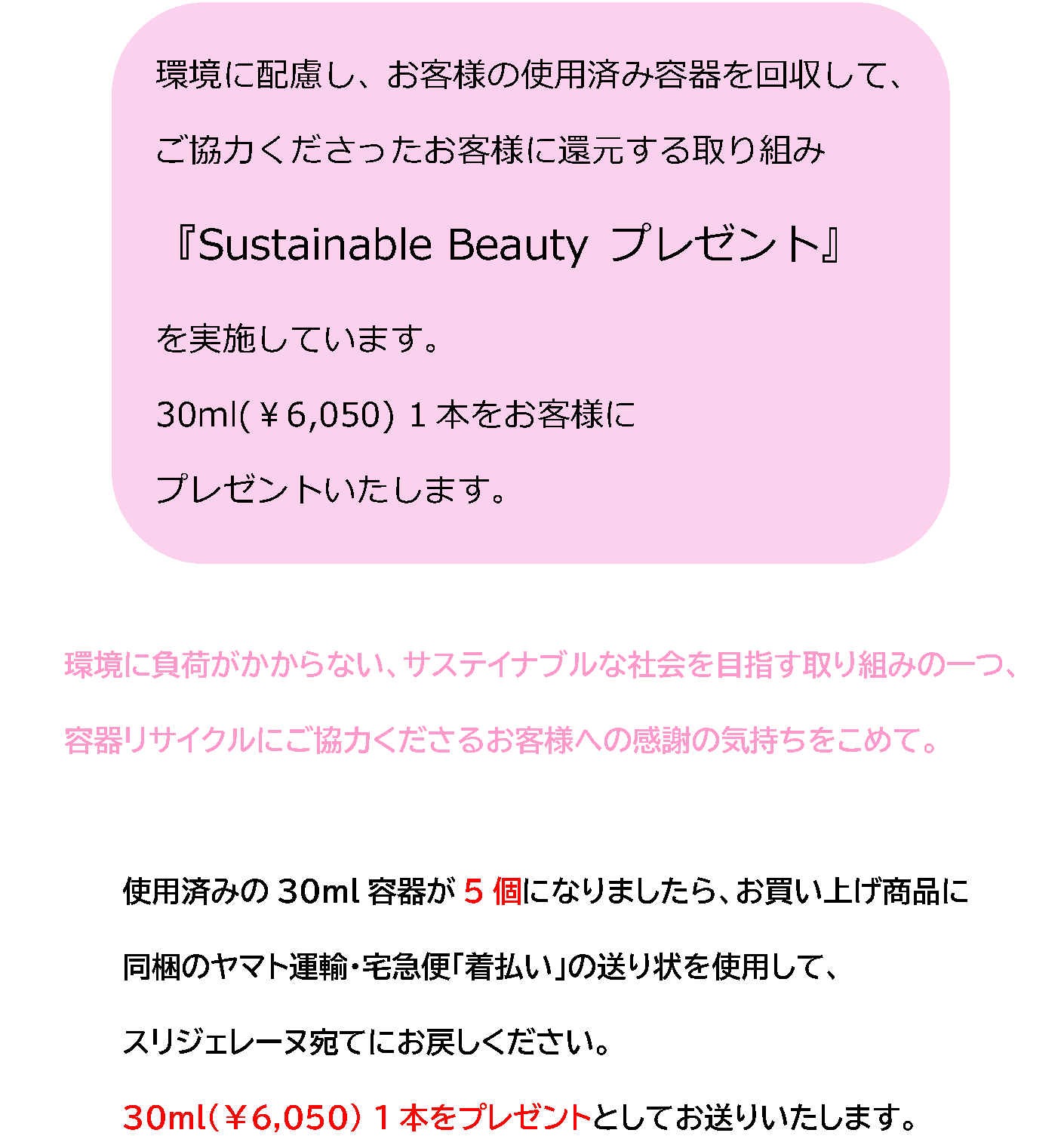 スリジェレーヌは、世界規模で取り組むサステイナブルな社会を目指しております。完全ではありませんが、まずは環境や生物多様性に配慮した容器を使用することで、お客様一人一人が、スリジェレーヌの容器を通して、持続可能な社会を目指すことができるということを、お伝えしていきたいです。