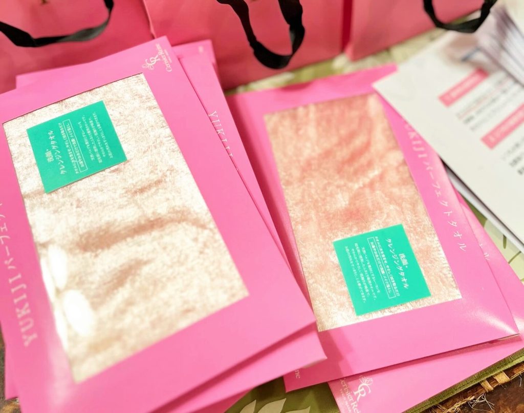 スリジェレーヌの美容オイルと、水で濡らしたタオルで顔を身体を拭くだけで肌の汚れが取れるパーフェクトタオルの寄付をさせていただきました。